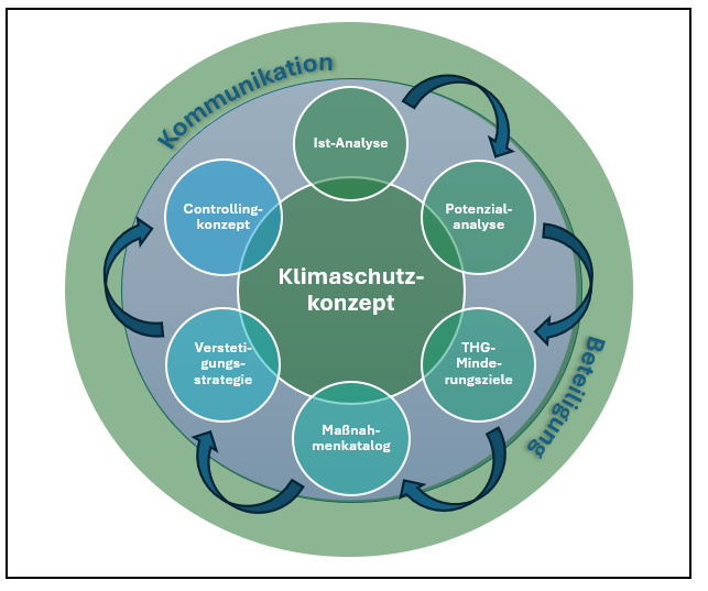 2. Anschließend werden in partizipativen Prozessen Einsparpotenziale für die unterschiedlichen Handlungsfelder bestimmt und daraus kurz-, mittel- und langfristige Ziele und Maßnahmen abgeleitet.