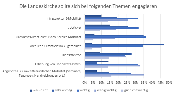 Die Umfrage hat ebenfalls ergeben, dass 70% der Befragten das Thema Kilmaschutz im Bereich Mobilität als ein wichtiges und sehr wichtiges Thema für die Landeskirche halten. Bei Klimaschutz im Allgemeinen sind sogar 80% der Befragten der Meinung, dass dies ein wichtiges bzw. sehr wichtiges Thema ist, mit dem sich die Landeskirche befassen sollte.